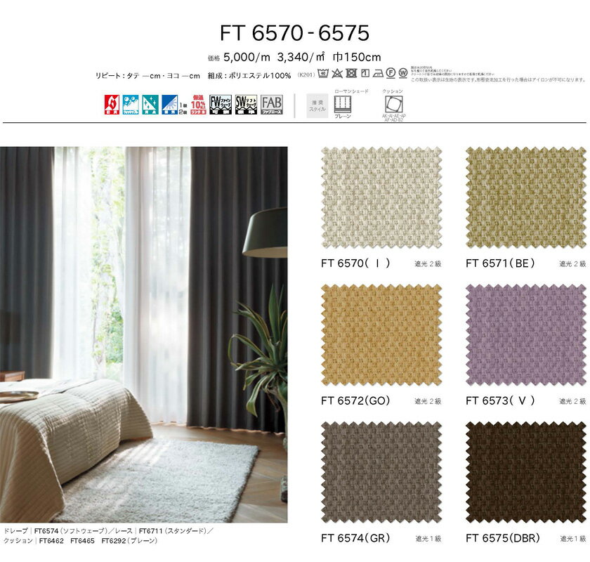 商品名川島織物セルコン FELTAシリーズ FT6570〜6575ドレープ スタンダード縫製(下部3ッ巻仕様)1.5倍ヒダ片開きサイズ幅、カン下寸法ともに1cm間隔で製作可能備考カーテン幅の寸法はカーテンレール両端の固定ランナー間より1.05倍程を推奨いたしております。